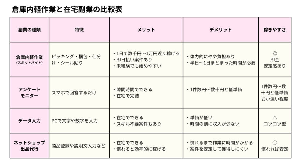 これらと倉庫内軽作業の違いを比較してみました。